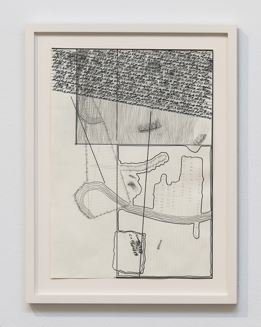 Graphite wall drawing, ink, graphite and push pins on paper, and framed "Orgueil"